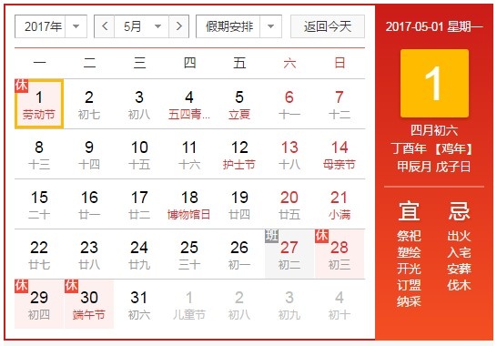 2017年五一勞動(dòng)節(jié)放假安排:2017年4月29日(星期六) 、4月30日(星期日)、5月1日(星期一) ,共休3天